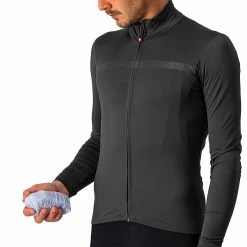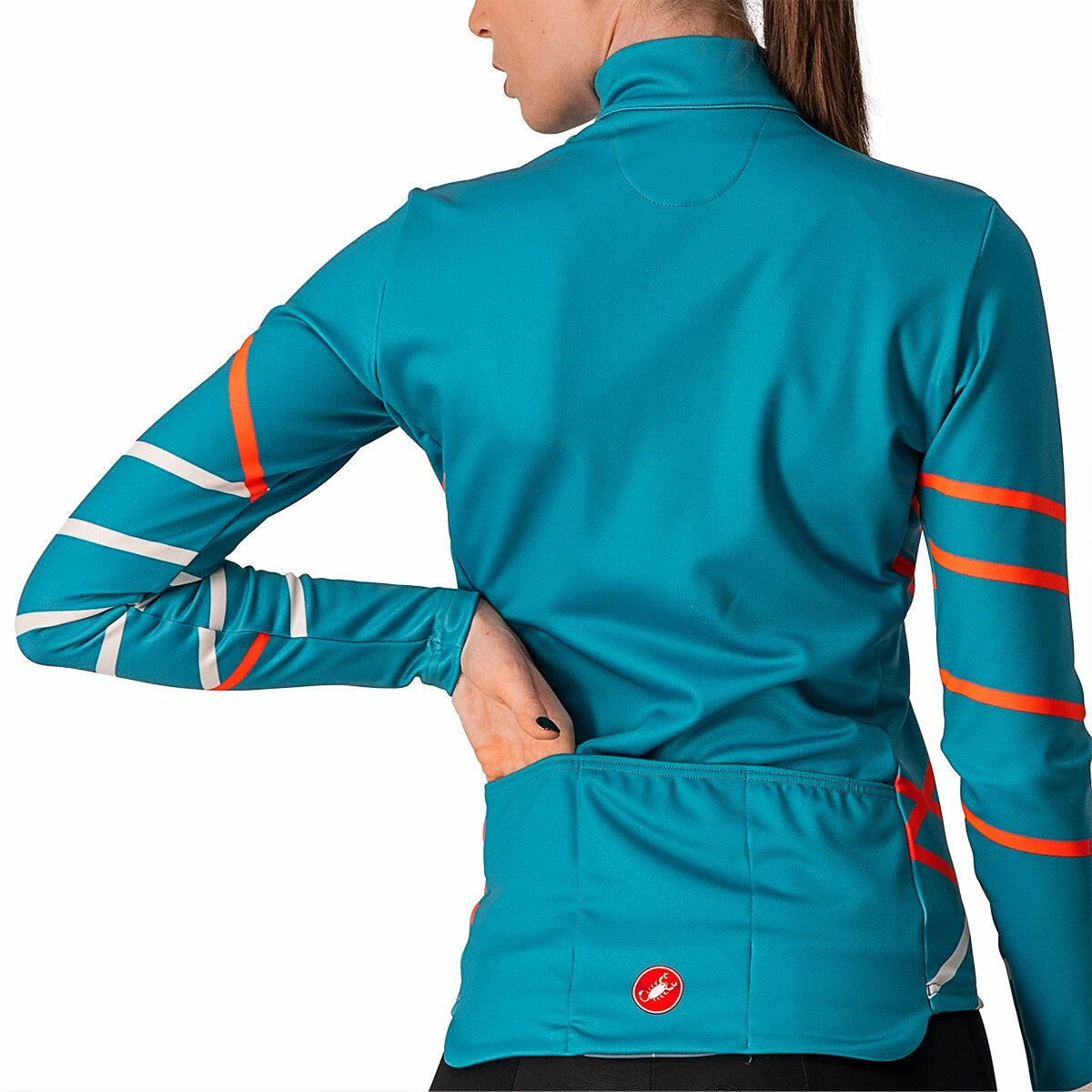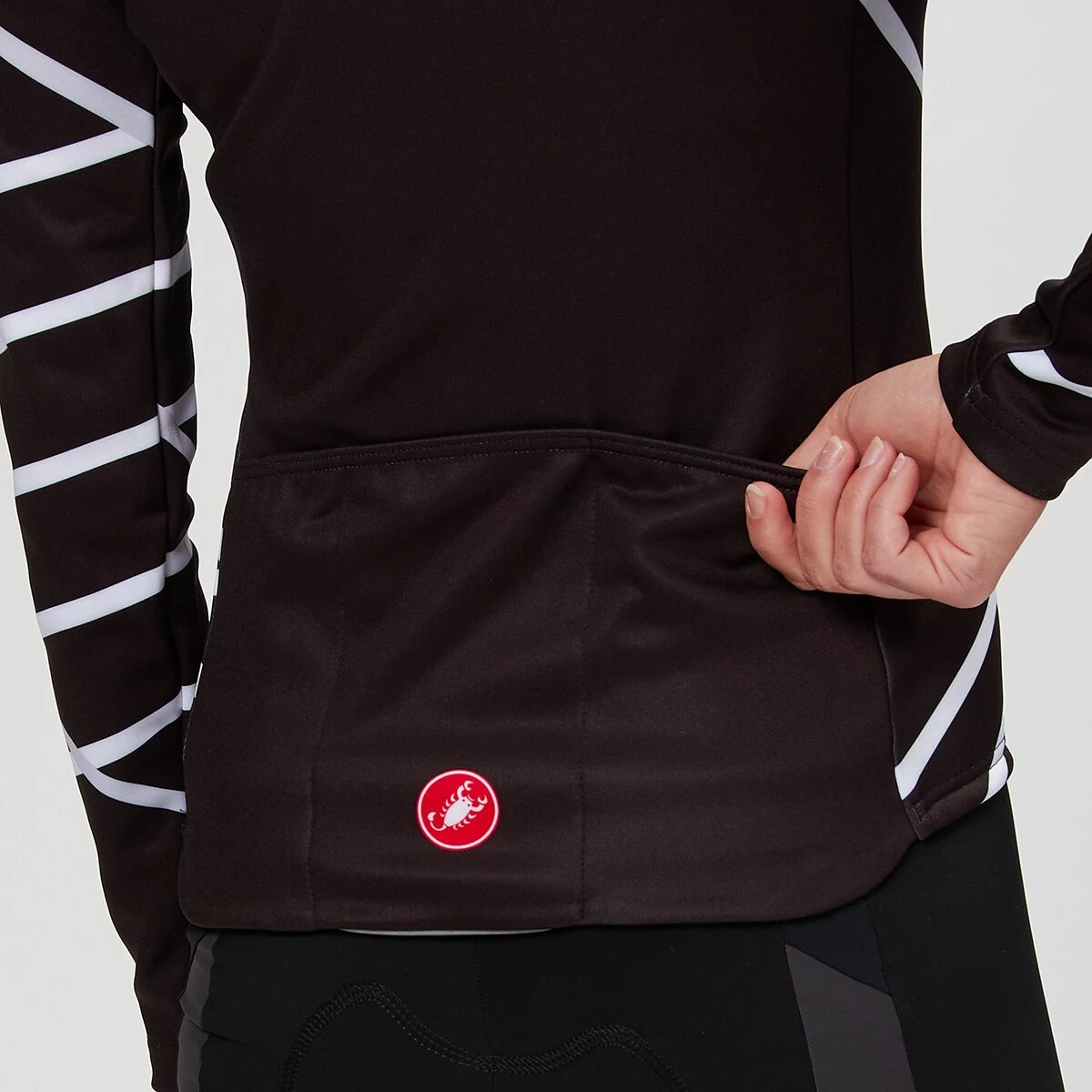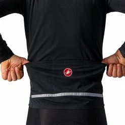 Castelli includes the standard rear pockets in a dropped fashion to enhance fit and riding comfort, while a reflective trim sits just below for low-light conditions. For a more aerodynamic fit that still affords similar thermal protection, the Castelli Triangolo jersey is a prime choice and reduces weight by over 100-grams.